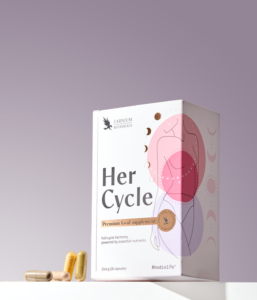 Her Cycle łączy silne naturalne składniki, które zapewniają przystosowane wsparcie Twojemu organizmowi przez cały miesiąc: