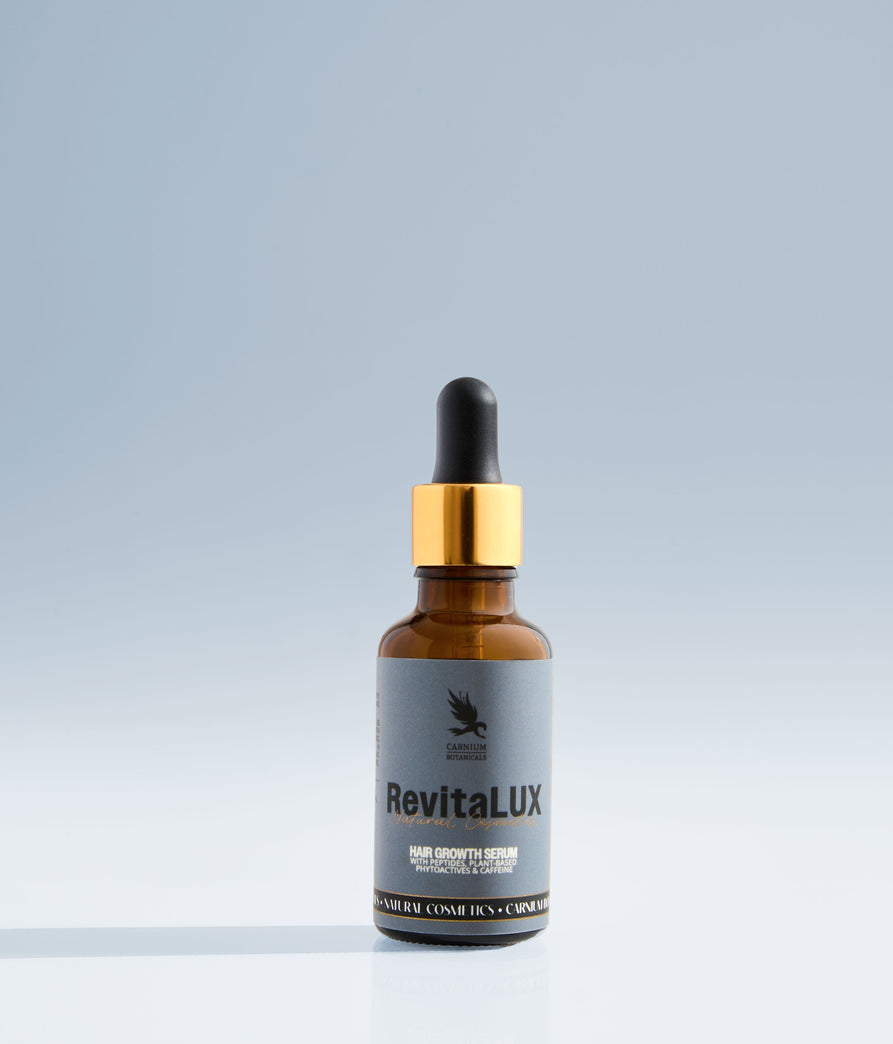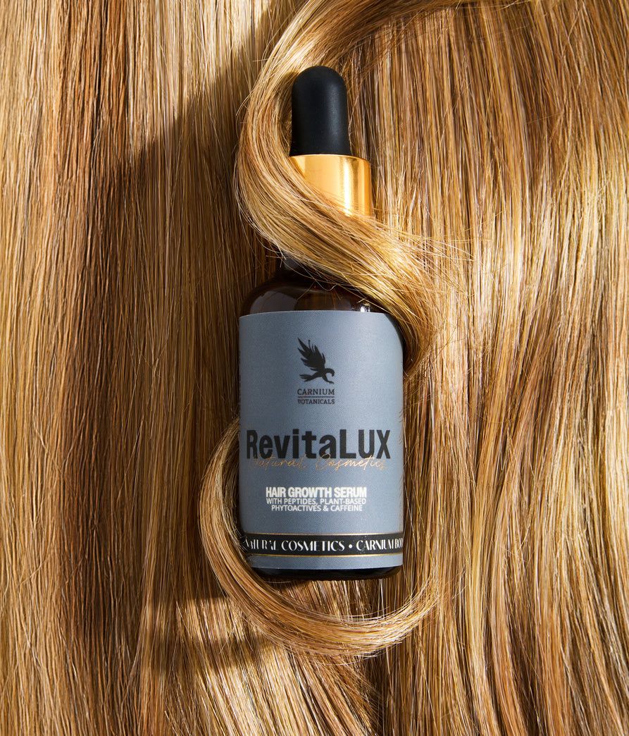 RevitaLUX to naturalne serum do włosów, opracowane z myślą o kobietach (i mężczyznach), którzy zmagają się z wypadaniem włosów, spowolnionym porostem włosów i wrażliwą, podrażnioną skórą głowy. Formuła zawiera sprawdzone składniki aktywne, takie jak hydrolat rozmarynowy, kofeina, aloes, pantenol i Capixyl™, które pielęgnują skórę głowy, wzmacniają mieszki włosowe i tworzą optymalne warunki do wzrostu zdrowych, mocnych włosów. Przy regularnym stosowaniu RevitaLUX: