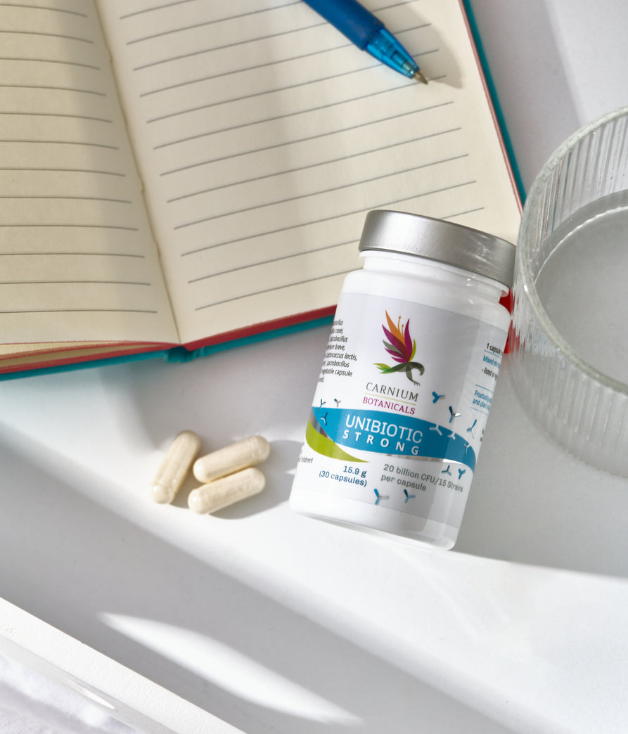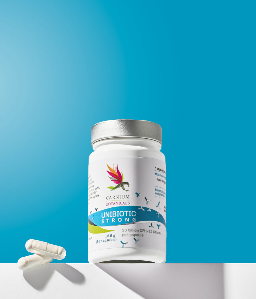 Unibiotic STRONG to suplement diety stworzony z myślą o wsparciu układu trawiennego i odpornościowego. Każda kapsułka zawiera wysoką koncentrację 20 miliardów jednostek tworzących kolonie (CFU) z 15 starannie wyselekcjonowanych szczepów probiotycznych, takich jak Lactobacillus acidophilus, Lactobacillus rhamnosus, Bifidobacterium breve i innych. Formuła wzbogacona jest o roślinny inulinę i fruktooligosacharydy, które pełnią funkcję prebiotyków, wspierając dodatkowo mikroflorę jelitową.